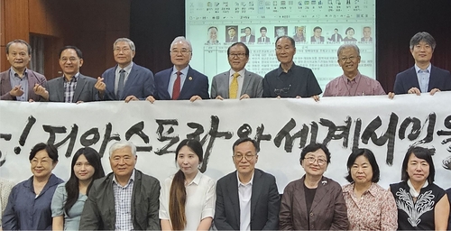 (서울=연합뉴스) 박현수 기자 = 지난 13일 서울 중구 장충동 종이나라박물관에서 열린 제10회 세계한국어교육자협회(WATK) 포럼에서 심용휴(앞줄 왼쪽서 5번째) 회장과 공동 주최자인 노영혜(앞줄 왼쪽서 6번째) 종이문화재단 이사장 등 주요 참가자들이 기념 촬영을 하고 있다. 2025. 07. 13. phyeonsoo@yna.co.kr