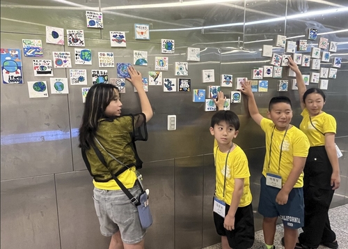 지난 5일 재일동포 초등학생들이 한국외대에서 열린 태극기 퍼포먼스에 참여한 후 평화 기원 메시지를 적어 '평화의 벽'에 붙이고 있다. [재외온라인 카지노 사이트협력센터 제공. 재판매 및 DB 금지]