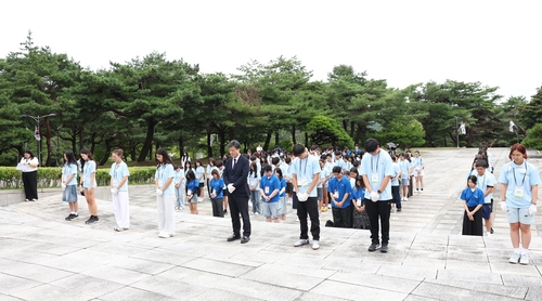 14일 충남 천안 소재 '국립 망향의동산'을 찾아 고국을 그리다 숨진 이민 선조들의 영면을 기원하며 참배하는 김영근 재외카지노사이트 주소협력센터장과 한인 청소년들. [재외카지노사이트 주소협력센터 제공. 재판매 및 DB 금지]